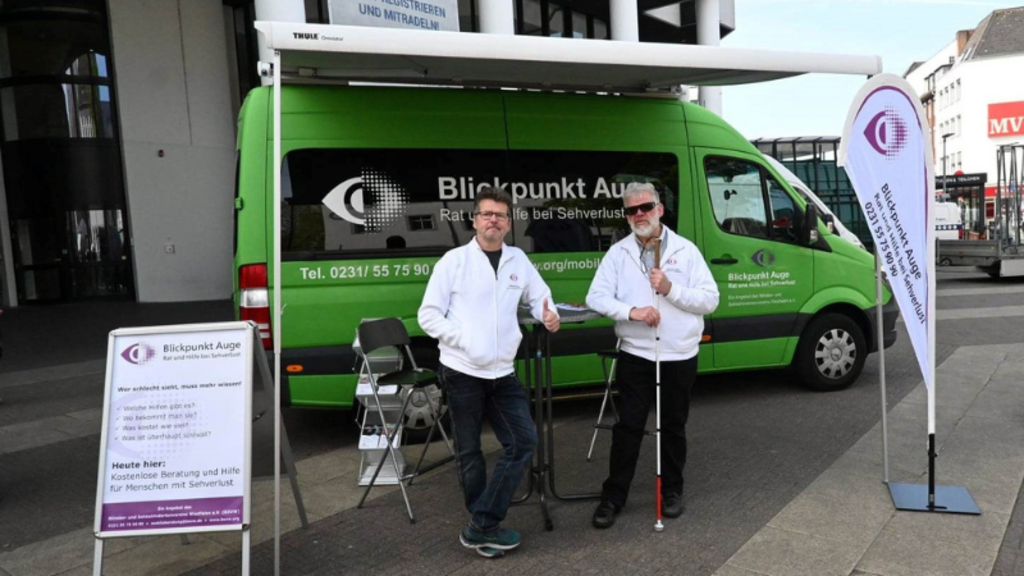 Der grüne Beratungsbus “Blickpunkt Auge” macht am Mittwoch, 1. Oktober 2025, nun auf Einladung von Monika Massenhove, Beauftragte für Menschen mit Behinderung der Stadt Siegen, erneut Halt in der Siegener Innenstadt.