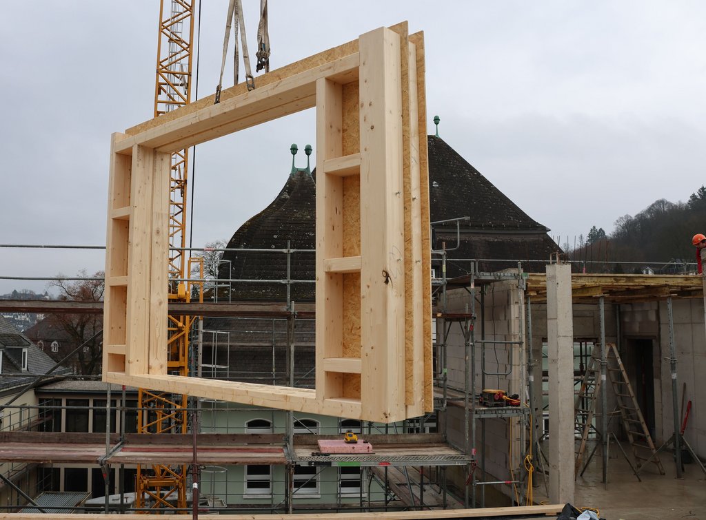 Die Vorbereitungen für die nächsten Arbeiten laufen bereits auf Hochtouren. Mehrere Gewerke sind derzeit parallel in den verschiedenen Gebäudeteilen beschäftigt und verlegen die Elektroverkabelung, Wasserleitungen und bereiten den Einbau der dezentralen Lüftungsgeräte in den Klassenräumen vor. Im zukünftigen Unterrichtstrakt (Gebäude B) haben Bauarbeiter bereits einen Teil der Wand entfernt, um die neue Pellet-Heizung zu installieren. Nur so können die beiden Heizkessel in den Heizungsraum eingelassen werden. In dem im Oktober errichteten Mensa-Holzbau gehen die Arbeiten ebenfalls weiter. Nach dem Einbau der Fenster wird nun die Fassade gedämmt und mit einer "Aluwelle" bekleidet.