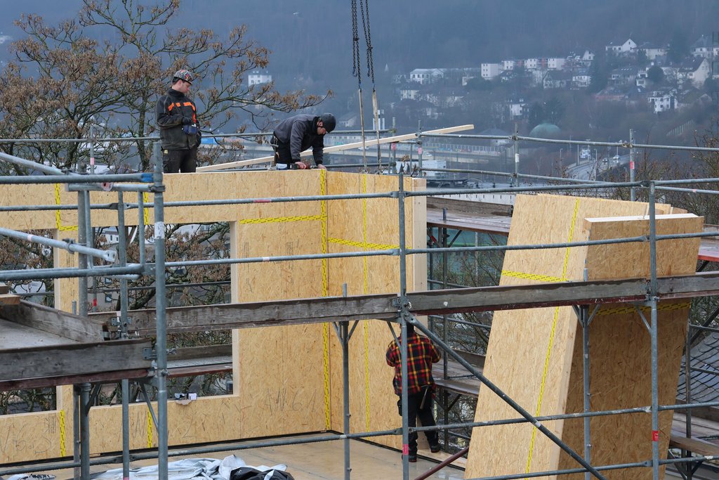 Die Arbeiten für den Aufbau sind technisch anspruchsvoll. Einige der Holz-Deckenelemente wiegen alleine rund 1,4 Tonnen. Ein Kran hob die einzelnen Wand- und Decken-Elemente auf den Pavillon, wo Zimmerleute sie dann befestigen konnten. Dachdecker dichten das Dach in den kommenden Wochen noch ab. Auch die Fenster fehlen noch, werden aber bald eingesetzt. Als nächstes kann der Innenausbau beginnen. "Wir haben einen weiteren wichtigen Schritt gemacht, um aus der alten Realschule einen modernen Grundschulstandort zu schaffen. In dem Pavillon können wir dann nicht nur zwei Klassenräume unterbringen, sondern auch die Ganztagsbetreuung. Damit schaffen wir als Stadt die Voraussetzung, Eltern ihren Rechtsanspruch auf Ganztagsbetreuung zu gewähren", sagt Bürgermeister Tristan Vitt.