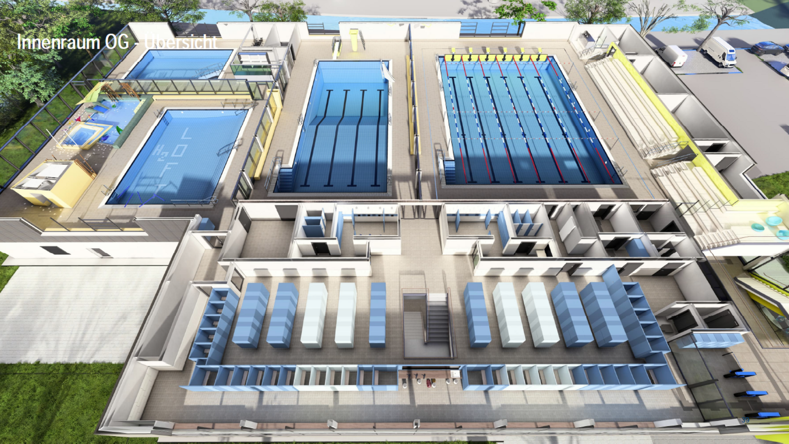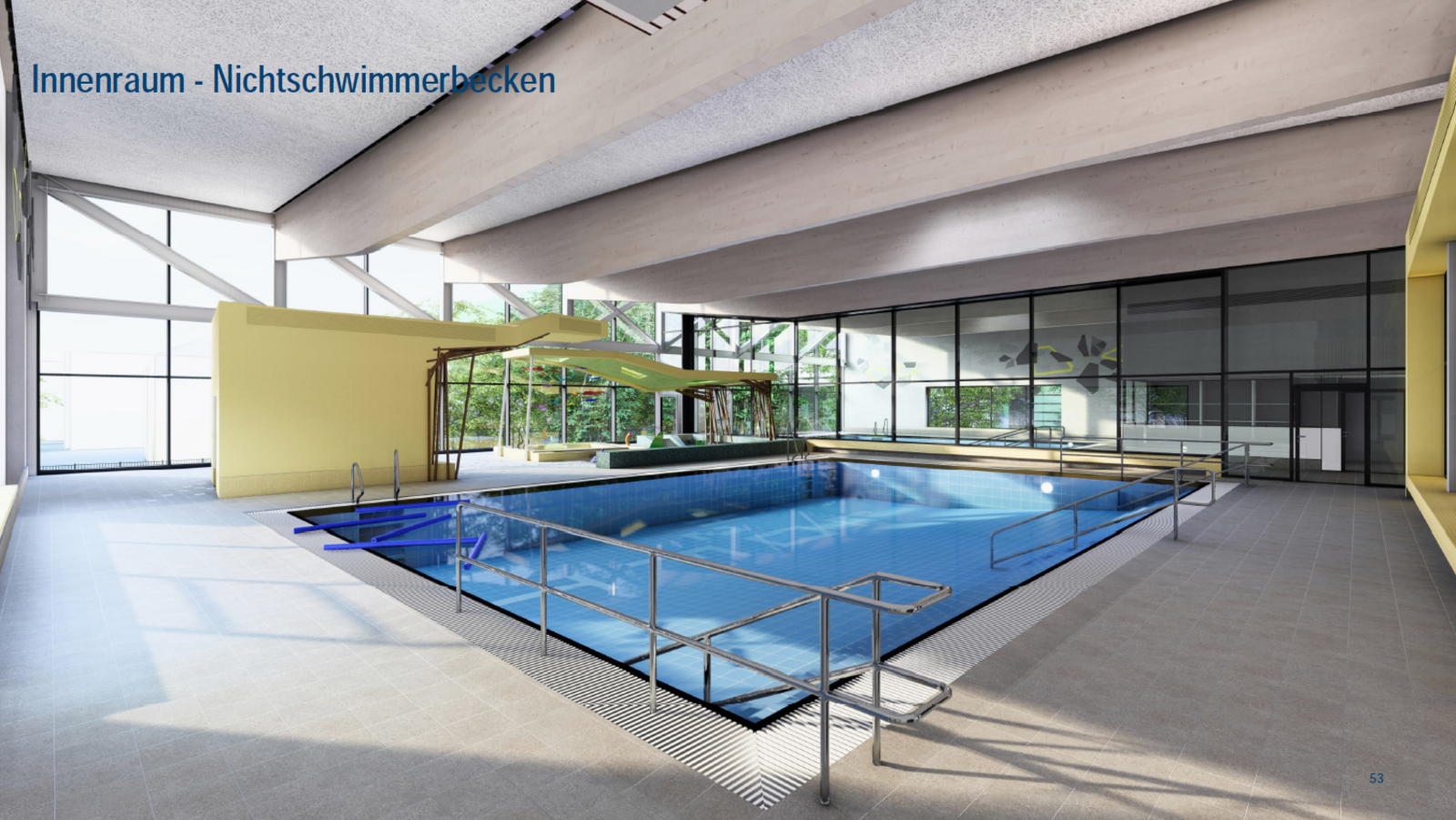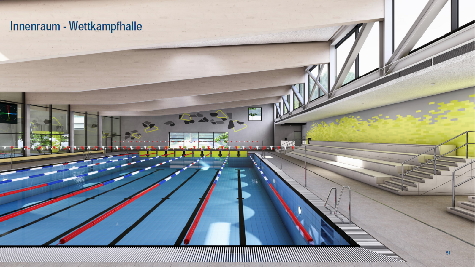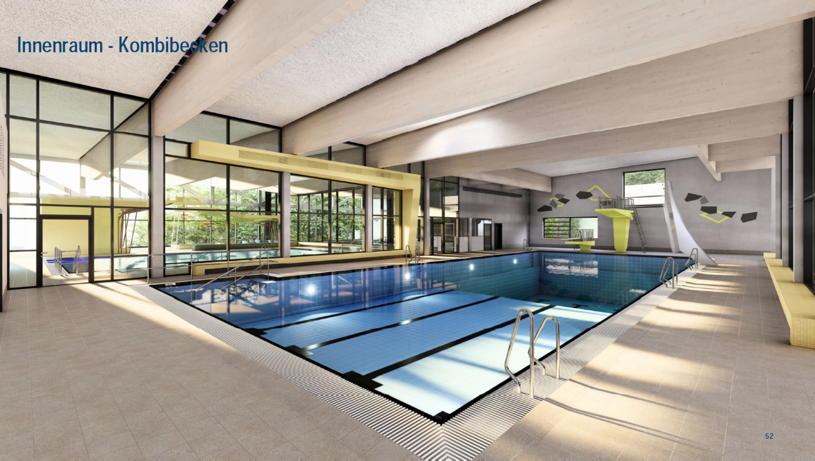 Auch die örtlichen Vereine wurden im Rahmen einer eigenen Beteiligungsveranstaltung aktiv in die Planung eingebunden. Die Ergebnisse aus diesem Austausch flossen ebenfalls in den Entwurf ein: Vorgesehen sind neben dem 25-Meter-Wettkampfbecken und dem 25-Meter-Kombibecken mit 1-Meter-Sprungbrett und 3-Meter-Sprungturm auch ein Kursbecken für Fitness- und Gesundheitsangebote sowie ein separates Lehrschwimmbecken.