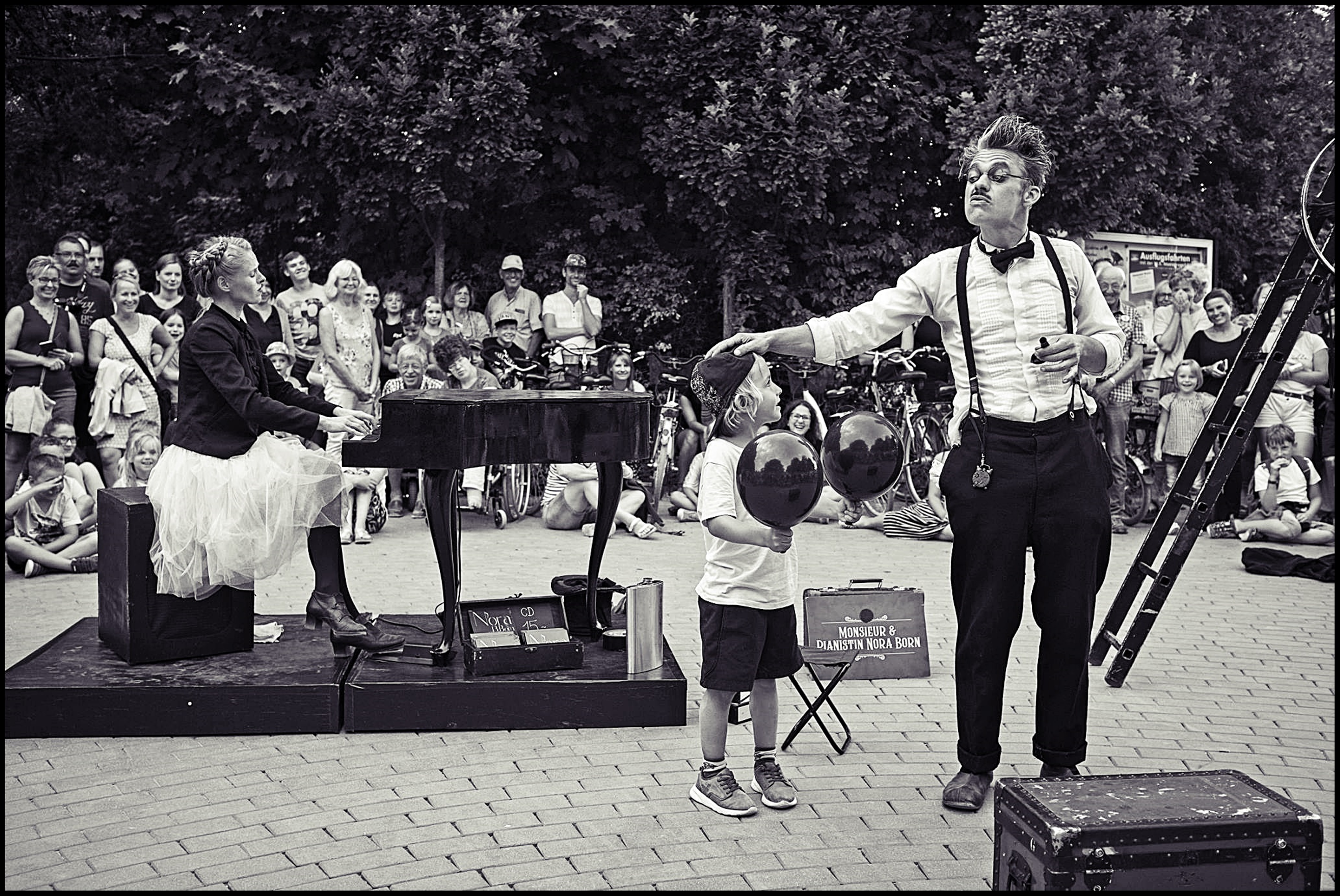Das preisgekrönte Programm „Monsieur macht Kunst! – Humor in schwarz-weiß” entführt das Publikum ins frühe 20. Jahrhundert. Der grimmige Clown Monsieur lässt durch Jonglage, Seiltanz und allerlei meisterhafte Manipulation eine bildgewaltige Show entstehen. Pianistin Nora Born sorgt mit ihrer musikalischen Begleitung am Miniaturflügel für das perfekte Stummfilm-Feeling – urkomisch und ganz ohne Worte.