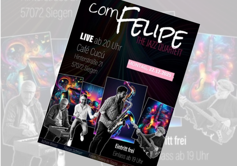 Com Felipe - The Jazz Quartet Com Felipe - das ist das Quartett um den Saxophonisten Felipe Oliveira de Sousa. Als bestens eingespielte Rhythmusgruppe der Uni-Big Band Siegen bilden Achim Weiß(Piano), Michael Grossenbacher (Bass) und Florian Schnurr (Drums) die perfekte Grundlagefür Felipe Oliveiras virtuose solistische Höhenflüge. Das Repertoire der Band ist so vielfältig wie der Jazz an sich: treibender Straight-Ahead Jazzwechselt sich mit erdigen Hard Bop-Grooves ab, die Eleganz des Bossa Nova trifft auf dieMelancholie der Jazz-Ballade, die Energie des Latin Jazz auf die Coolness des Blues.